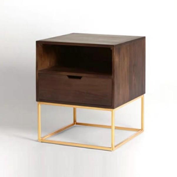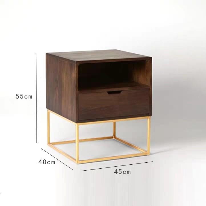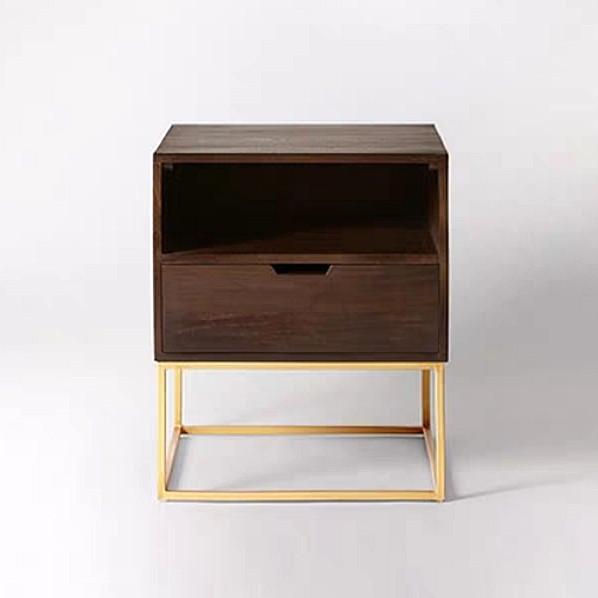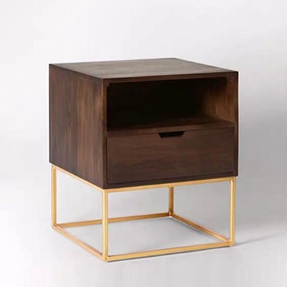 Perched on slender gold wireframe legs with a solid wood drawer as a storage box and table top, this Alina minimalist modern design is a bold statement piece while remaining true to its function as a night stand , lamp table, or bedside.
