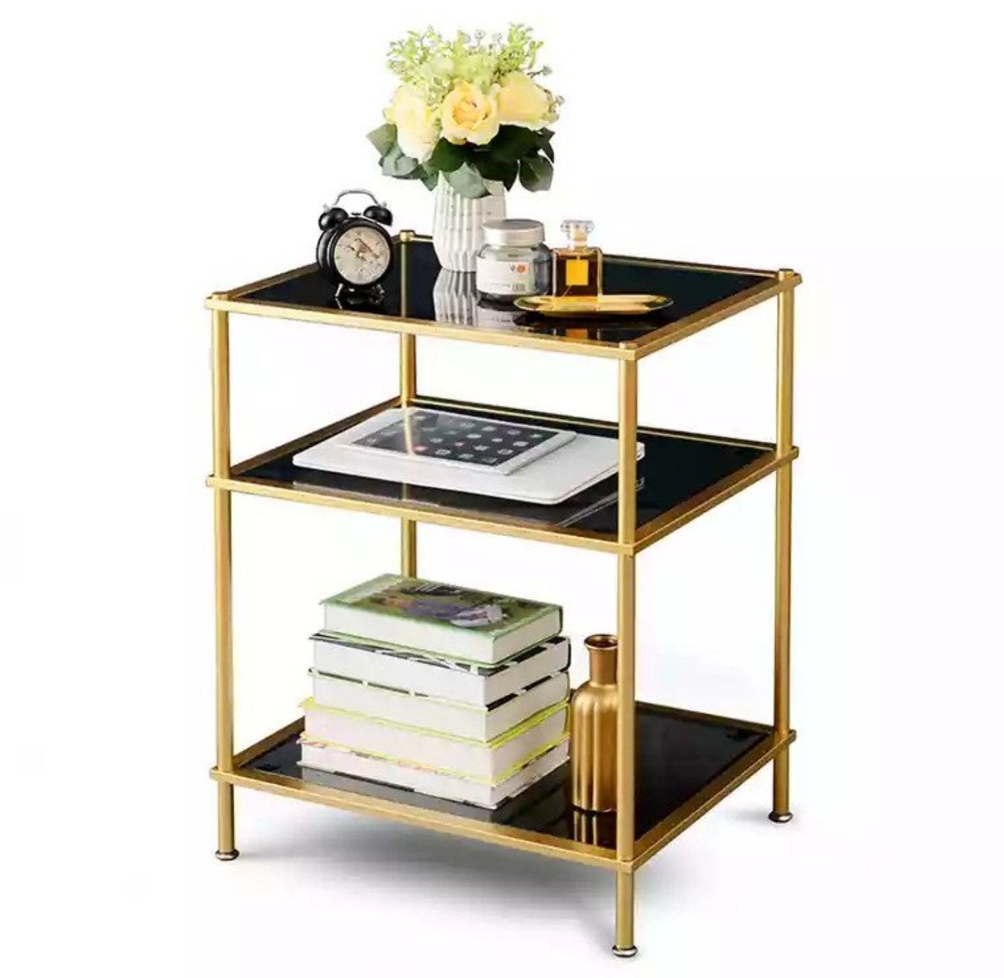 Arya is an elegant yet classic gold framed double tier side table, bedside topped with 3C tempered glass, this durable and timeless design complements any modern, retro or vintage interiors.