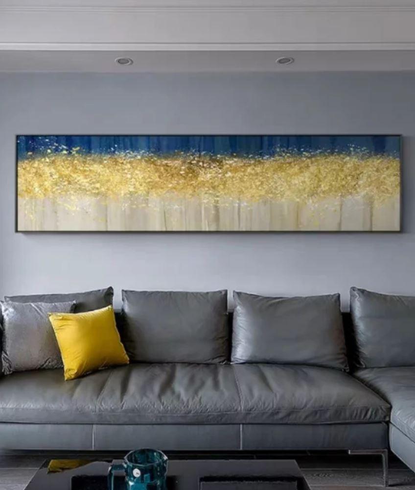 The Daisy canvas painting features golden trees against an evening blue night sky, dotted with gold dust which alludes to the beauty of nature and calm. Sophisticated and serene, this classy piece is perfectly suited for decor of any style, from contemporary to modern classic. Showcase it in your living room, foyer, kitchen, bedroom, bathroom or lounge for family and guests to admire. Choose from three frame colours - black, gold, or silver.