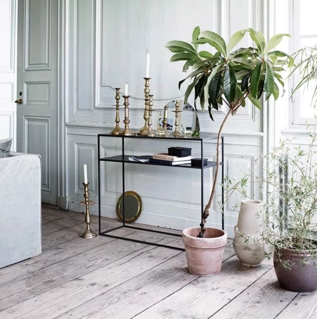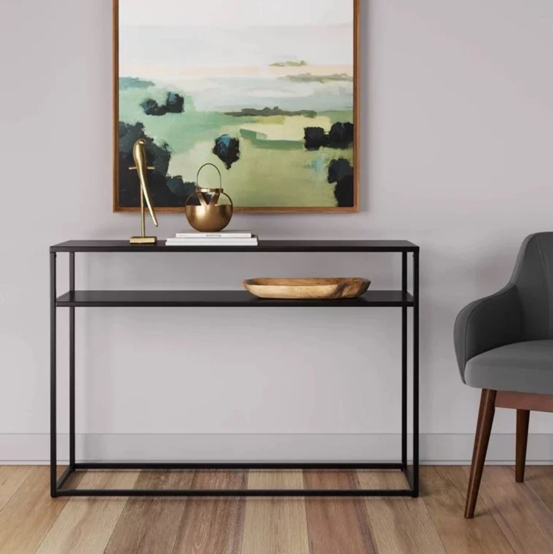 Both practical and space enhancing, this Quinn minimalist wireframe hallway console table features a clean white / black two tiered framework and adds to your bedroom, hallway, lounge setting, or sits against any empty wall as a great filler, statement piece and holder for ornaments, keys and fobs, and paintings.