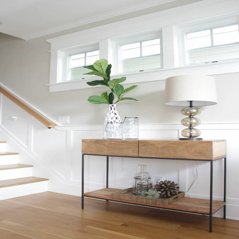 Willowa Courtyard is designed with deep drawers for convenient safekeeping of your accessories and knick knacks and important safe keep , this modern rustic entryway hallway console table is a timeless feature piece worthy of envy. Balanced on slim powder coated metal stilts, the contrast between the large wood blocks and sleek legs lend an air of edginess to the design.